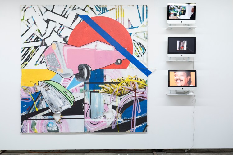 Bak, Lak, Speaker, Rood/Groen – 3x 120×80 – lacquer, plaster, speakers on panel – 2017